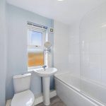 White suite comprising of WC with low-level flush, wash hand basin with chrome tap over, panel bath with chrome taps and mains feed shower. Extractor fan. Wood effect flooring. Central heated radiator. UPVC frosted double glazed window to the side elevation.