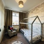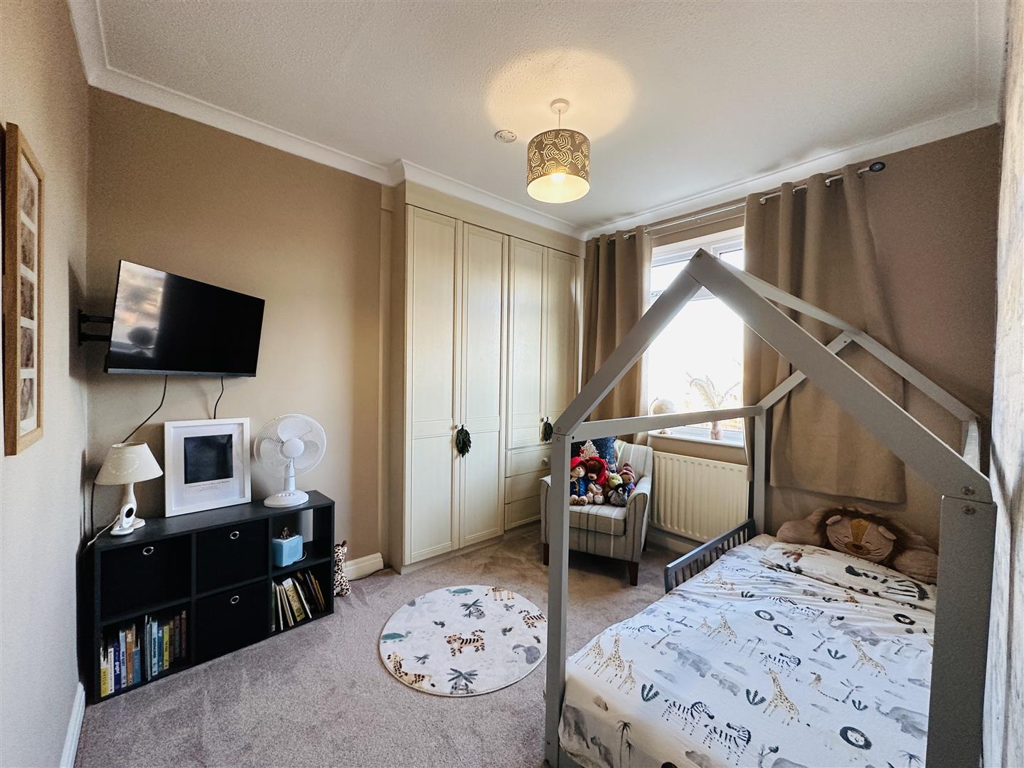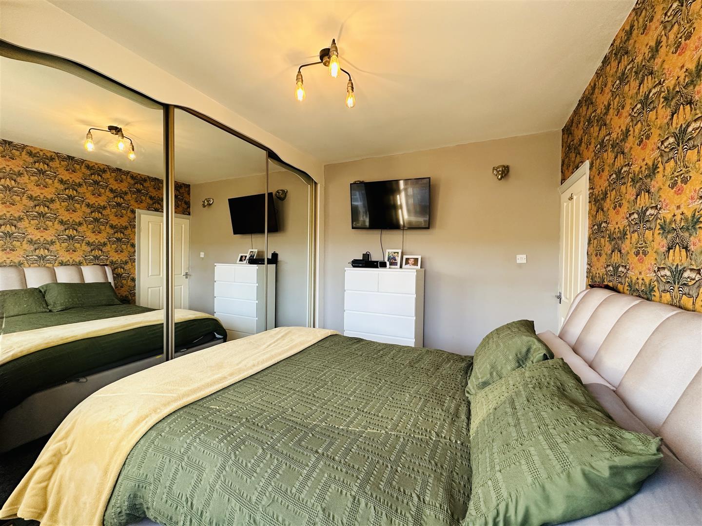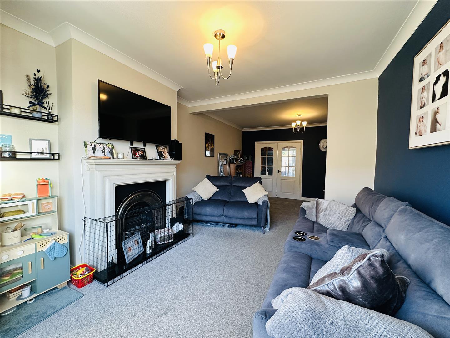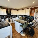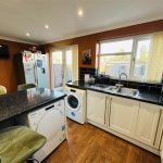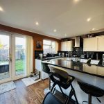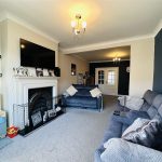 The patio doors from the kitchen open up to a rear garden, providing outdoor space for children to play or for hosting summer gatherings. The garden is fully enclosed and mainly laid to lawn, ensuring privacy and security. Additionally, there is a detached garage at the rear, offering convenient storage or potential for a workshop.