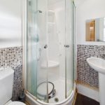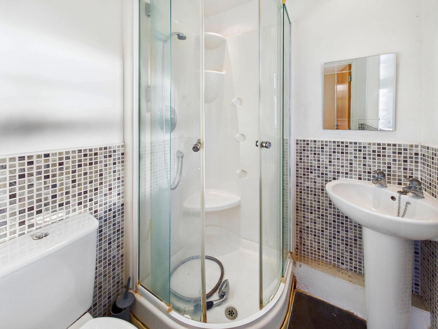Three piece suite comprising: low level W.C. corner shower cubicle with power shower and pedestal wash hand basin with both hot and cold taps. Part tiled walls, vinyl flooring, extractor fan and white uPVC double glazed window to side elevation.