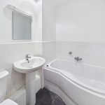 Three piece suite comprising: low level W.C. pedestal wash hand basin with both hot and cold taps, P-shaped bathtub with chrome mixer tap. Part tiled, vinyl flooring and extractor fan.