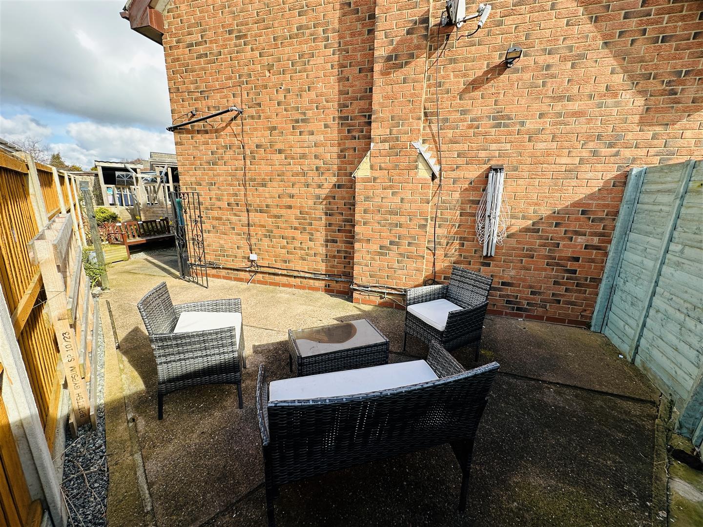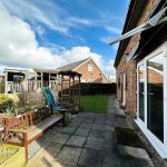 Enclosed rear garden, predominantly laid to lawn with block paving area.