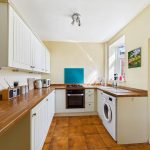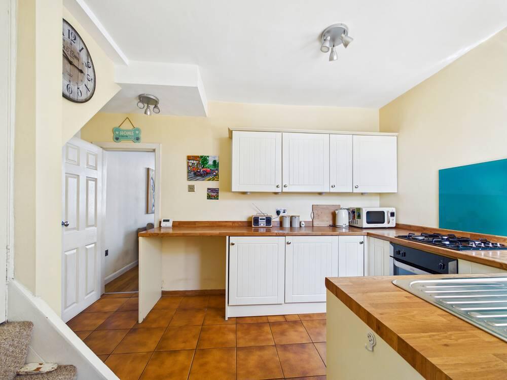 Range of high and low level kitchen units with integrated appliances including fridge / freezer, washing machine and oven and four ring hob. Sink with drainer and chrome taps over. Tiled effect flooring. Central heated radiator. UPVC double glazed window to the rear. Access to the bathroom and stairs leading to he first floor.