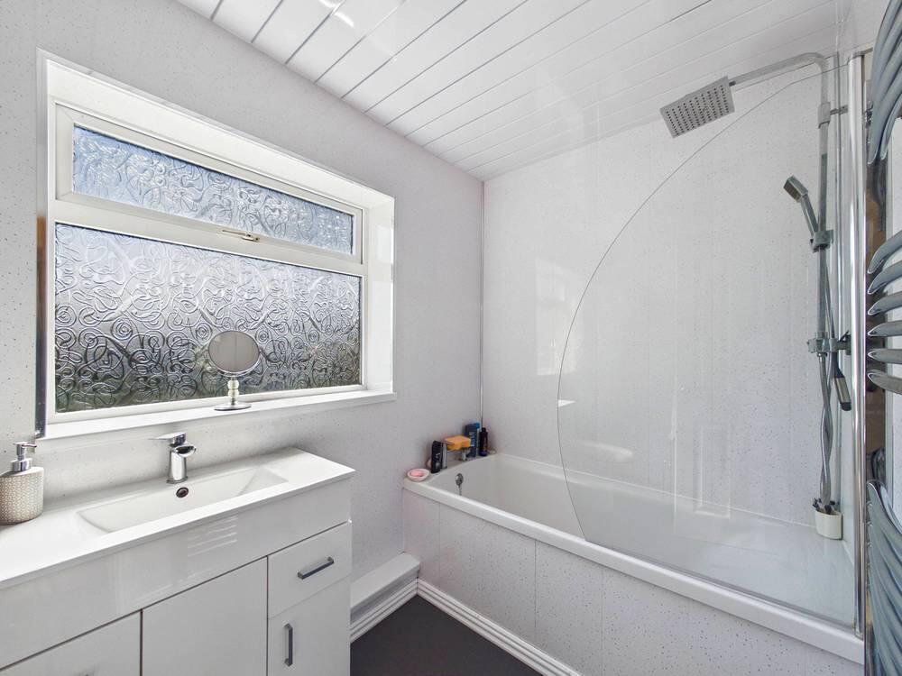 White suite comprising of WC with low level flush. Wash hand basin with chrome mixer tap. Panel bath with chrome taps, shower screen and mains feed shower. Chrome central heated towel rail. UPVC double glazed frosted window to the rear.