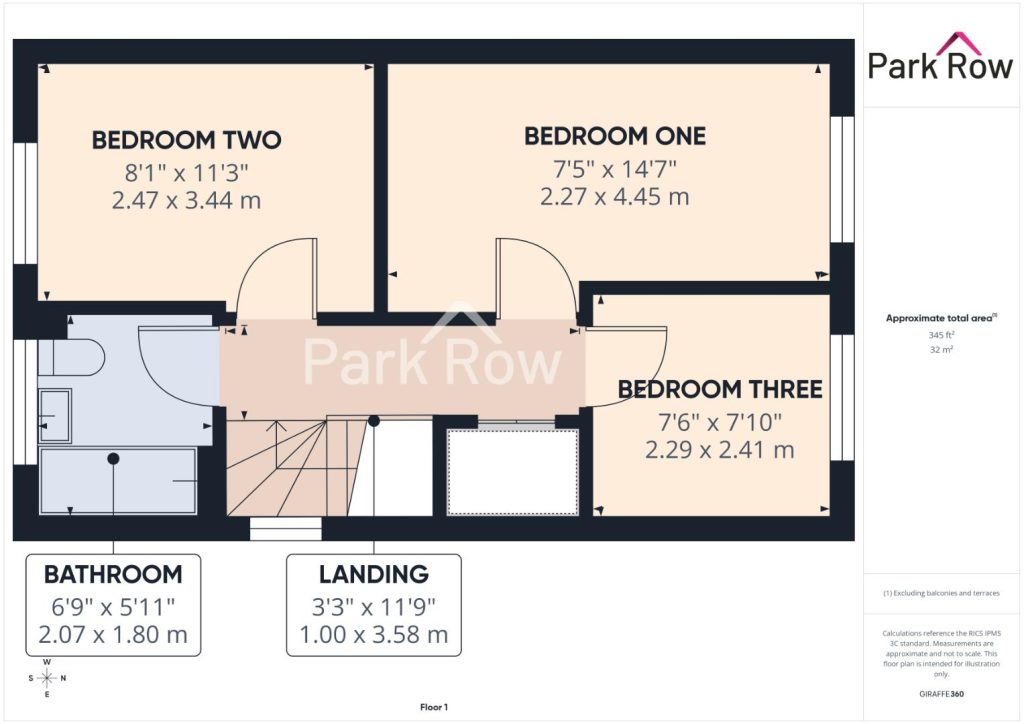 BEDROOM ONE 4.45 c 2.27 (14'7" c 7'5")