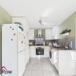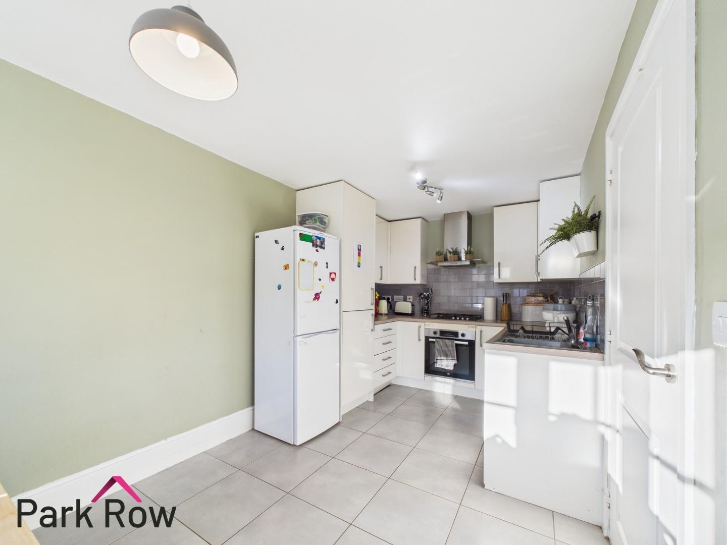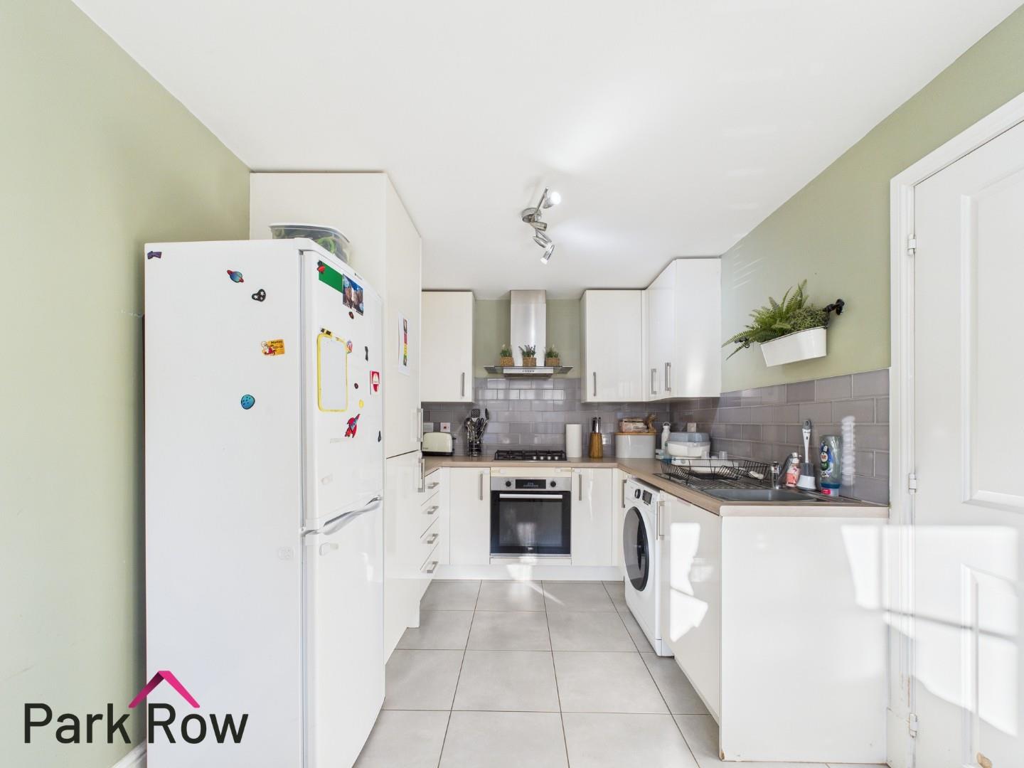 A double glazed window to the front elevation, white gloss wall and base units, wood-effect laminate worktop, built in electric oven, a four ring gas hob with a built in extractor fan over, space and plumbing for a washing machine, stainless steel drainer sink with chrome taps over, tiled splashback, space for a freestanding fridge/freezer, a central heating radiator and tiled flooring.
