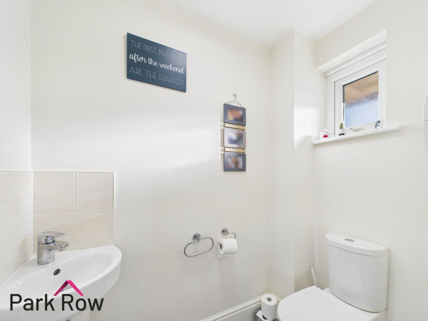 An obscure double glazed window to the front elevation and it includes; a close coupled w/c, a corner hand basin with chrome taps over and tiled splashback plus a central heating radiator.
