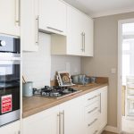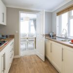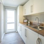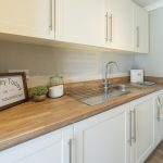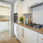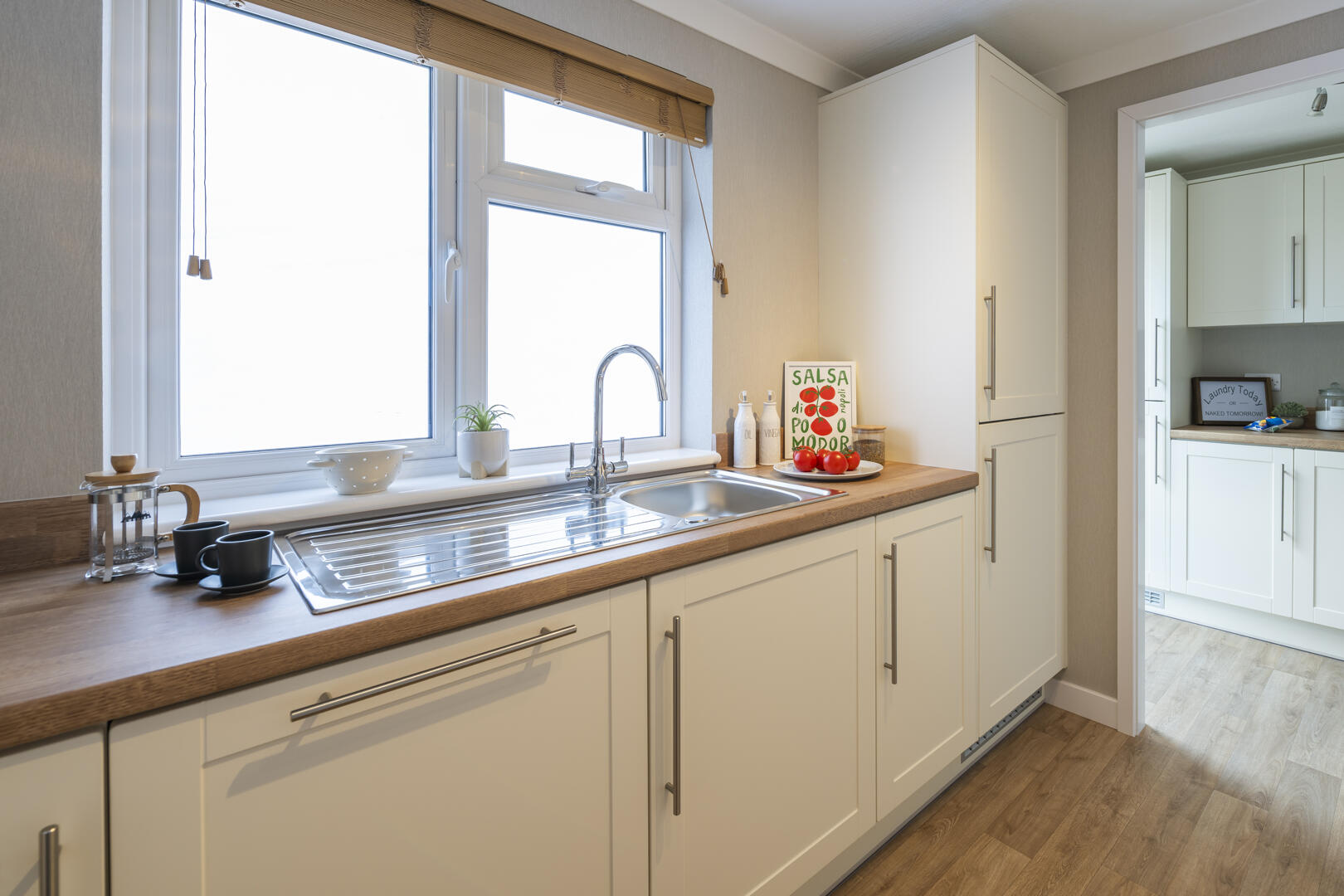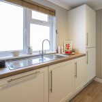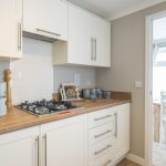The kitchen is a practical and well-organised space featuring cream cabinetry with sleek silver handles and wooden-effect worktops that add warmth. Appliances include a built-in oven and gas hob, with a tiled splashback behind the hob. The layout maximises space efficiency, with ample cupboard and countertop area, including a stainless steel sink positioned beneath a window that floods the room with natural light. Flooring is a wood-style vinyl, offering durability and ease of maintenance. An internal door leads through to the dining area, enhancing the flow of the home.