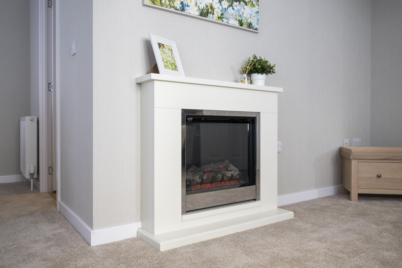 The lounge is an inviting space filled with natural light from multiple windows, including a bay window area that adds charm and extra space. The room is carpeted in a soft neutral shade and features comfortable seating arranged for relaxation and conversation. A modern electric fireplace serves as a focal point, surrounded by subtle décor and simple furnishings that enhance the bright and airy feel of the room. Neutral curtains frame the windows, complementing the calm colour palette of the walls and carpet.