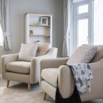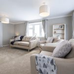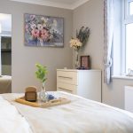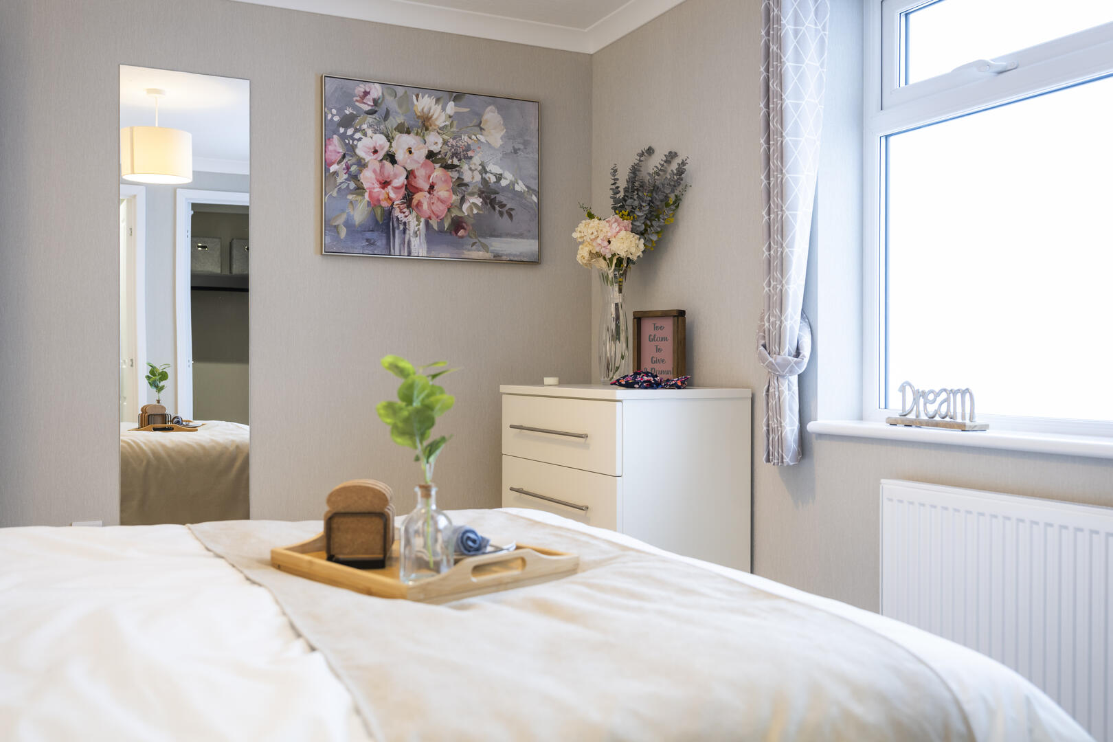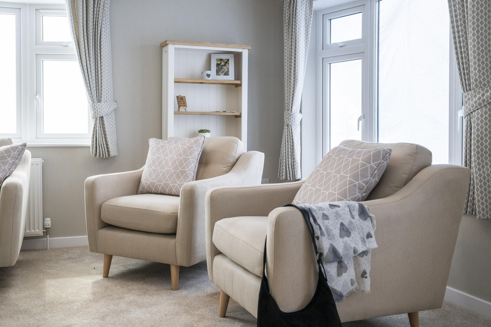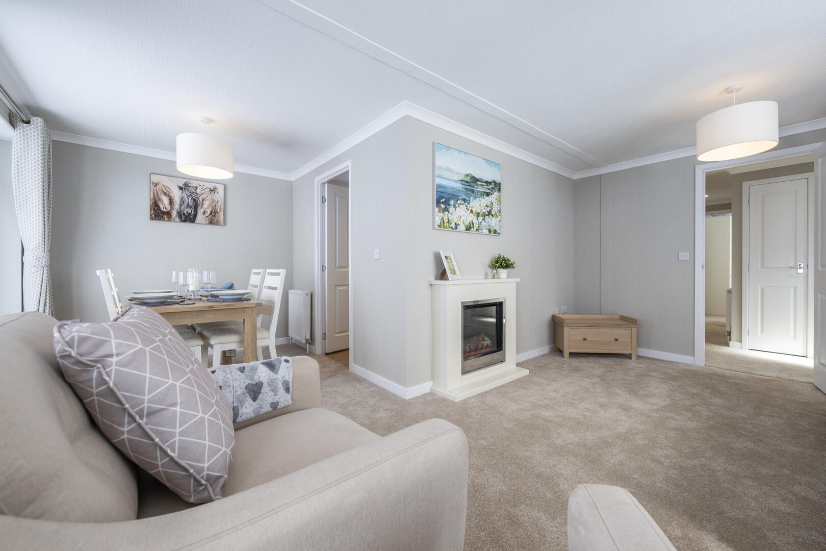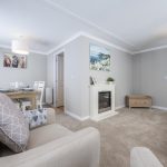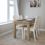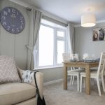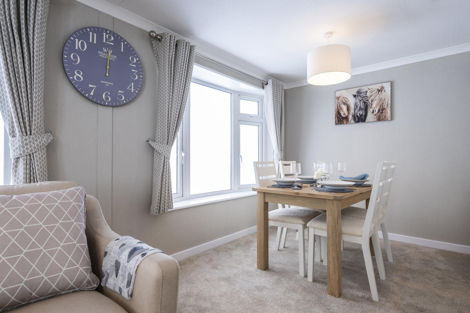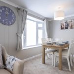 The dining area is a cosy nook with a wooden table and four chairs set against a backdrop of light walls and carpet. Natural light streams through the adjacent window, enhancing the fresh and welcoming atmosphere. Curtains match those in the lounge, creating a sense of continuity in this open-plan space. This area is perfect for intimate meals or casual dining, with simple décor that keeps the focus on comfort and function.