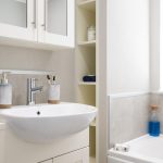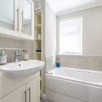 The bathroom is tastefully fitted with a white suite including a bath with shower over, a vanity sink unit with storage, and a WC. Neutral tiling with a subtle pattern complements the light decor, while a window with blinds offers privacy and natural light. Practical shelving beside the sink provides useful storage space for toiletries.