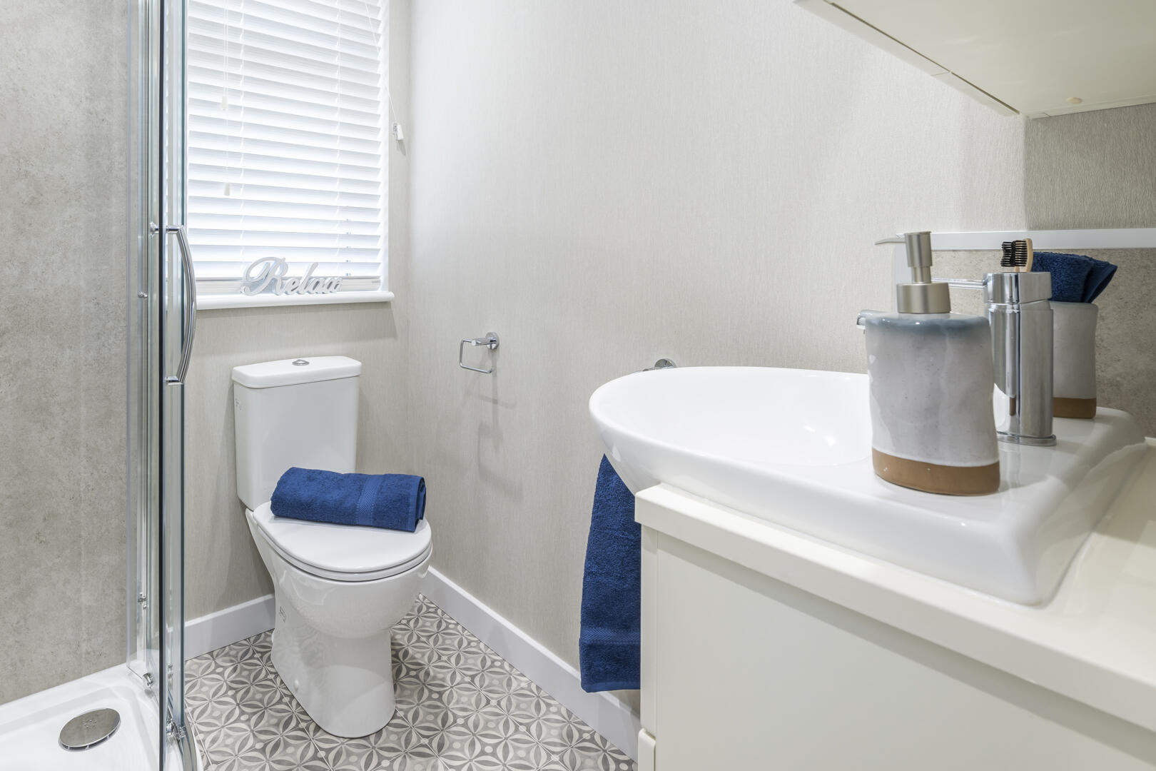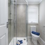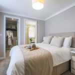 Bedroom 1 is a bright and comfortable room decorated in soft neutral tones with carpet underfoot. It features a double bed flanked by bedside tables and enjoys plenty of natural light from a large window. This bedroom benefits from a walk-in wardrobe with built-in shelving, providing excellent storage space. An en-suite shower room adds convenience, fitted with a modern shower cubicle, WC, and wash basin, all finished in neutral tones with patterned floor tiles and a window with blinds for privacy.