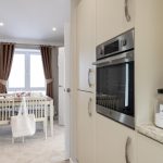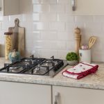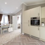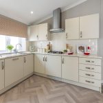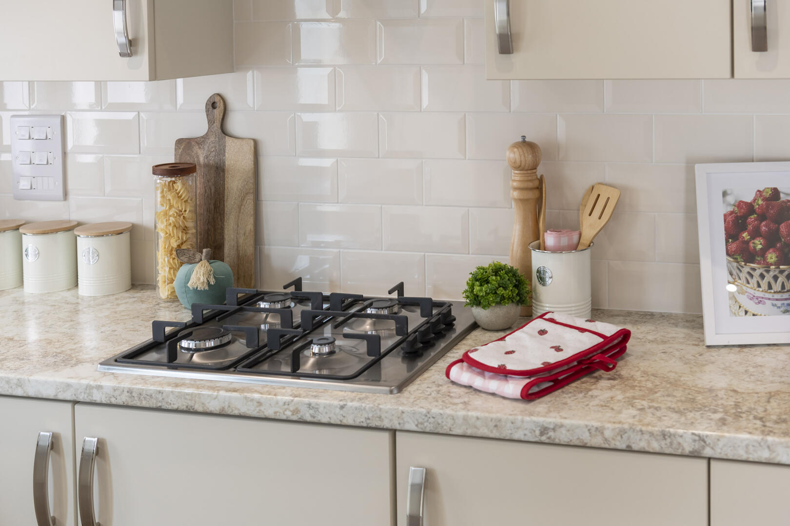 The kitchen is thoughtfully designed with a practical layout, featuring cream-coloured cabinets topped with marble-effect work surfaces and a tiled backsplash. Integrated appliances include a built-in oven and a four-burner gas hob with an extractor hood above. A large window over the stainless steel sink brings in natural light, while a patterned vinyl floor adds a modern touch and durability to the space.