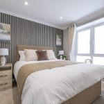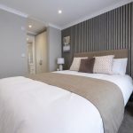 The master bedroom is a relaxing retreat with a soft carpet underfoot and a feature wall with vertical panel detailing behind a large upholstered bed. Neutral curtains frame a sizeable window that floods the room with natural light. Matching bedside tables with lamps add symmetry and style, while the overall decor remains warm and welcoming.