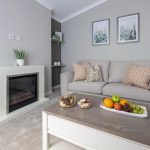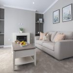This bright and inviting lounge features a and soft carpeting, creating a cosy atmosphere. Two large windows allow plenty of natural light to flood the room, highlighting the neutral walls and contemporary decor. A comfortable sofa faces a stylish electric fireplace, flanked by built-in shelving units that add an elegant touch and provide practical storage space. The room flows seamlessly into the dining area, enhancing the open-plan feel.