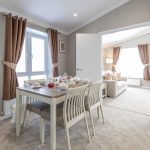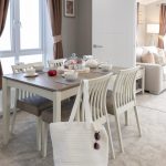 The dining area complements the open-plan lounge and kitchen, featuring a simple wooden dining table with four chairs positioned beside two large windows dressed with warm curtains. This space benefits from ample natural light and connects comfortably to both the lounge and kitchen, making it ideal for family meals and entertaining.