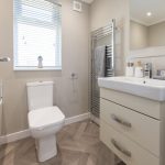 This well-appointed bathroom features a modern white suite with a deep bathtub and a separate shower enclosure. The walls are finished in a light, neutral tone that complements the practical flooring. A sleek, wall-hung vanity unit with an inset basin provides storage, while a tall heated towel rail adds comfort and convenience.