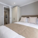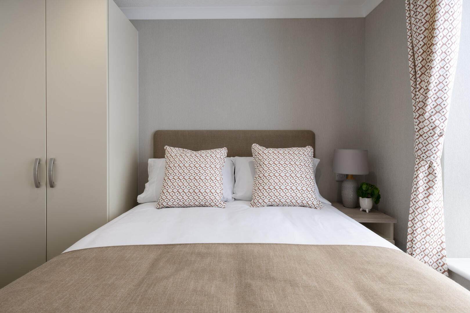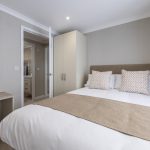 This comfortable bedroom features a double bed dressed in neutral linens with matching cushions and a beige bed runner. A wardrobe and a small dressing table provide storage and practicality. Soft carpeting and light-coloured walls create a calming atmosphere, complemented by a window that lets in natural light.
