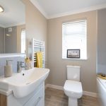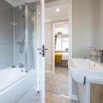 The main bathroom is fitted with a bath and shower, a wash basin with storage beneath, and a toilet. The pale flooring and neutral walls contribute to a crisp and airy feel. A window provides natural daylight to the room, enhancing the overall light and fresh ambiance.