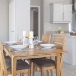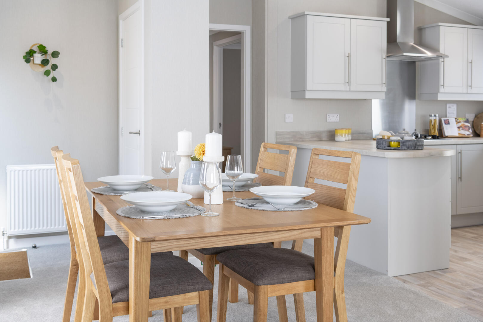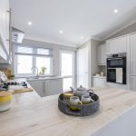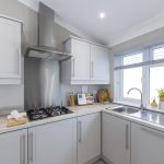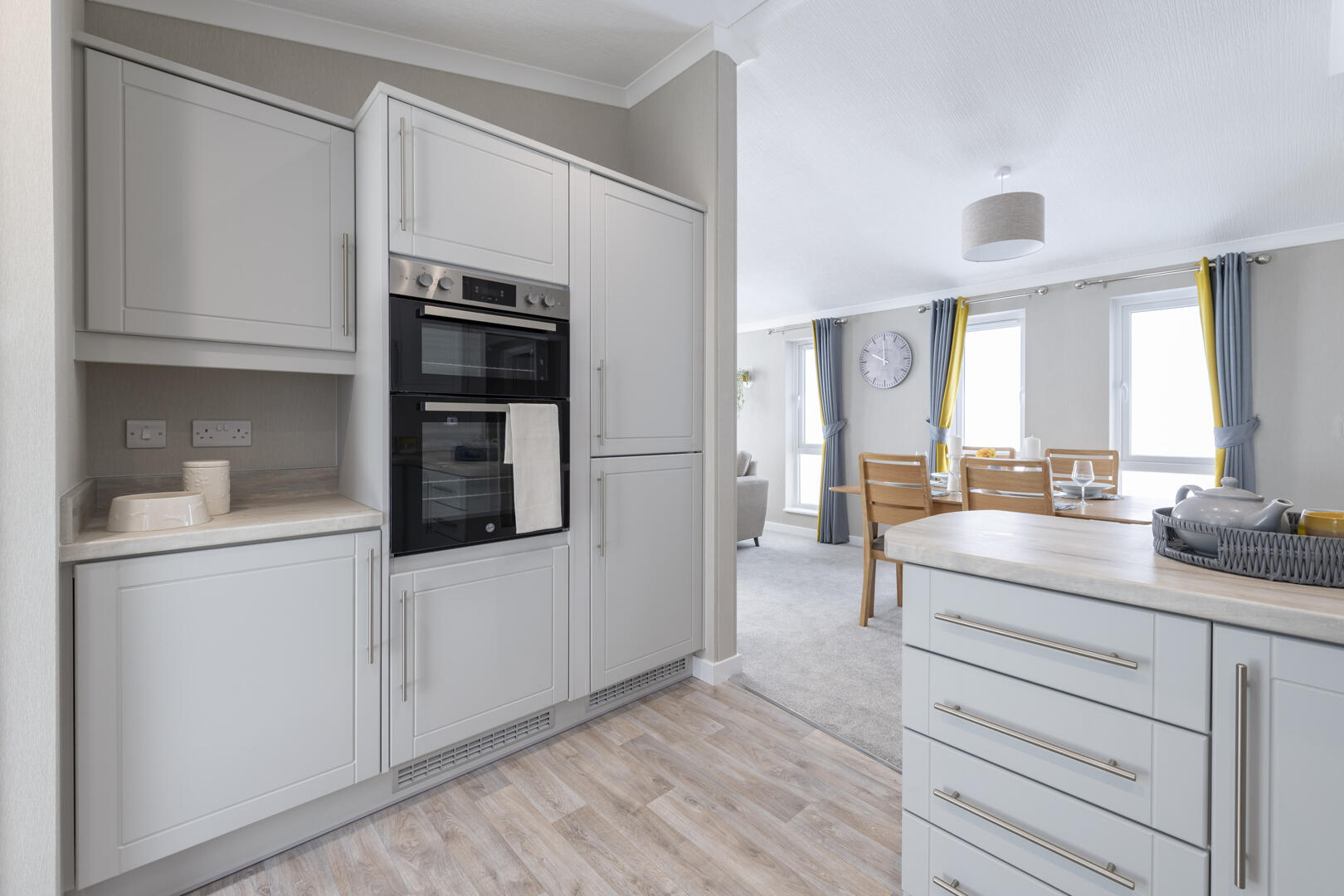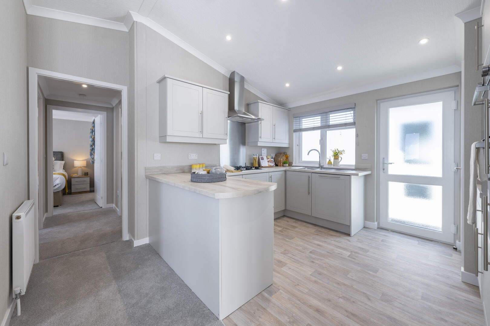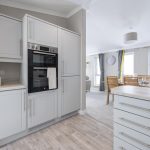 The kitchen is modern and practical, featuring a U-shaped layout that maximises work space. Soft grey cabinetry sits beneath light wood effect countertops, paired with stainless steel appliances including a built-in oven, gas hob with extractor hood, and an integrated fridge-freezer. A large window above the sink allows plenty of daylight in, while recessed ceiling lights add brightness. The kitchen flows naturally to the dining area, making it ideal for social cooking and entertaining.
