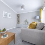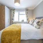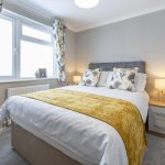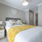 This comfortable double bedroom is decorated in soft neutral tones with a calming grey feature wall behind the bed. The bed is dressed with white linens and accented with mustard and floral cushions and throws that add warmth and a pop of colour. Beside the bed is a matching bedside table with a lamp, while opposite, storage is provided in a combination of wardrobes and drawers. A window dressed with floral curtains fills the room with natural light.