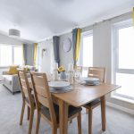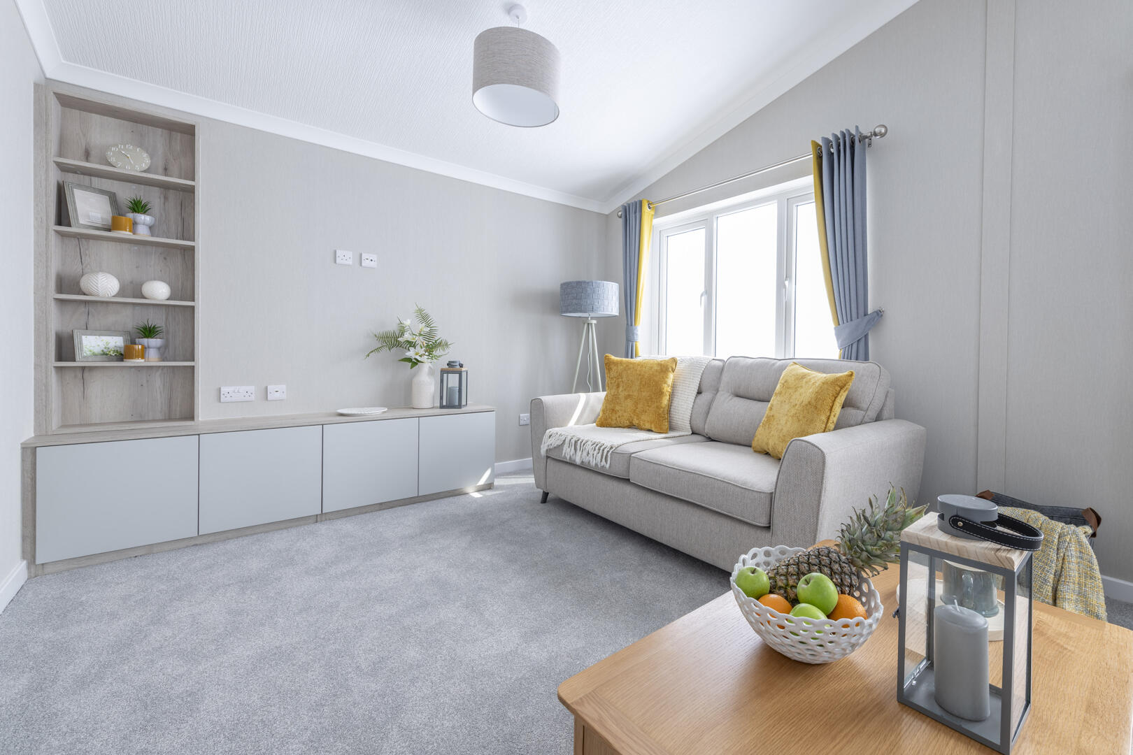 This inviting living and dining area is bright and spacious, with large windows that fill the space with natural light. Soft grey walls and carpeting create a calm backdrop for the room, complemented by mustard and grey curtains that add a cheerful touch. Two comfortable sofas are arranged around a light wood coffee table, making a perfect spot for relaxation. The dining area features a solid wood table with four chairs, positioned near the windows for an airy feel, seamlessly connecting to the kitchen space beyond.