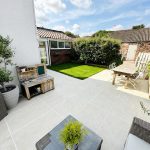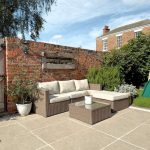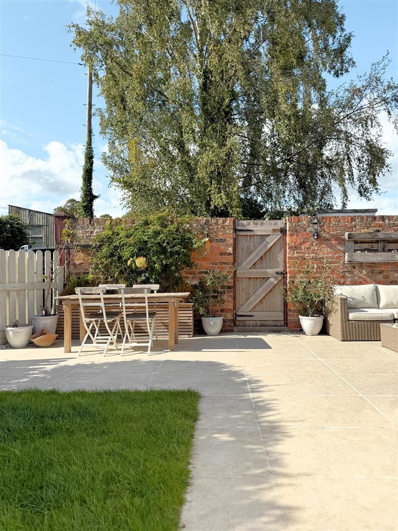 Fully enclosed, predominantly laid to patio with lawned area. Parking area for multiple vehicles and outbuildings.