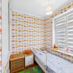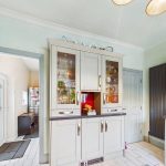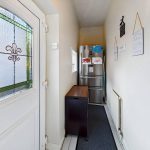 This utility space offers practical storage and access to the garden, featuring a decorative stained glass door that adds character. The flooring and neutral decor create a clean, functional area perfect for coats, shoes, and additional household storage. With access to the WC.