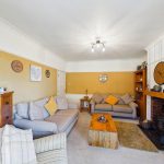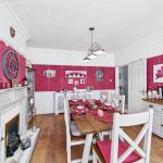 This dining room is a charming space characterised by a large bay window to the front elevation allowing for natural light to fill the room. The decor adds warmth and character, while wooden flooring enhances the traditional feel. The room features a classic fireplace with a detailed mantelpiece, creating a cosy focal point. Ample space is provided for a dining table and chairs, making it ideal for family meals or entertaining guests.