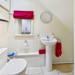 White suite comprising of, WC with low level flush. Wash hand basin with chrome mixer tap. Spotlights to the ceiling. Storage cupboard. Wall mounted combi boiler. UPVC double glazed window to the side elevation. Tiled flooring.