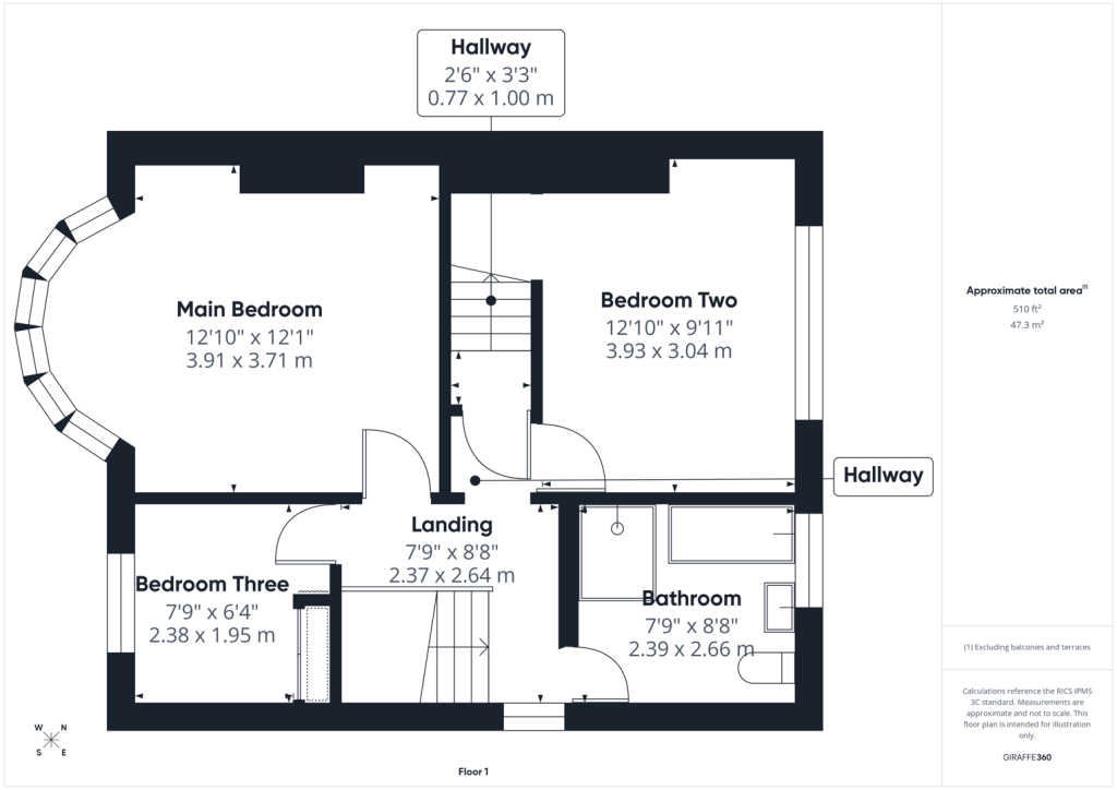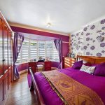 This main bedroom features a large bay window which fills the room with natural light. The decor includes wooden flooring which adds warmth with the modern decor. The room includes ample fitted wardrobes and storage making it highly functional.