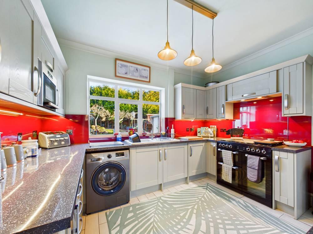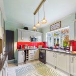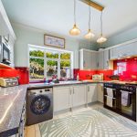 The kitchen is a bright, modern space featuring sage green cabinetry with contrasting dark countertops and a vibrant red glass splashback that adds a pop of colour. It is equipped with a large range cooker and option to reconnect plumbing for washing machine or dishwasher as well as an integrated wine fridge. A window overlooking the rear. There is ample storage space and the kitchen connects to the utility and hallway. Tiling to the floor.