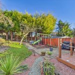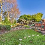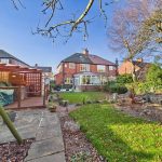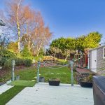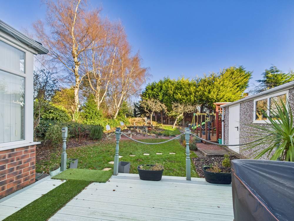 The rear garden is a generous, well-maintained outdoor space combining lawn, mature trees, and established shrubbery. It features a decked patio area perfect for seating and entertaining, a paved pathway, and a children's play area. A detached garage is accessed at the side, with additional space for storage or gardening. The garden extends to a secluded section with further planting and mature trees, providing privacy and a tranquil atmosphere.