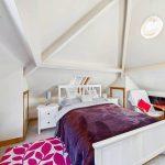 This attic bedroom enjoys a spacious feel with a high vaulted ceiling and exposed beams that add architectural interest. The room is furnished with a neutral tones. While skylights provide ample daylight.
